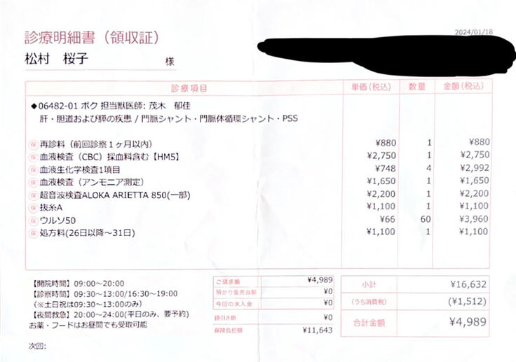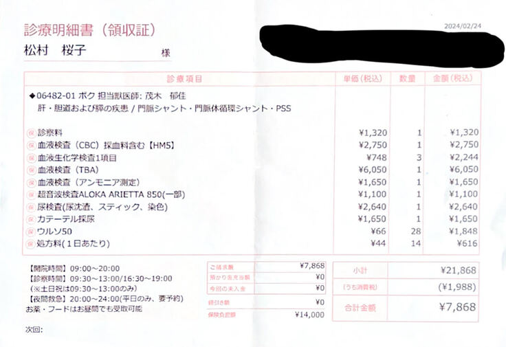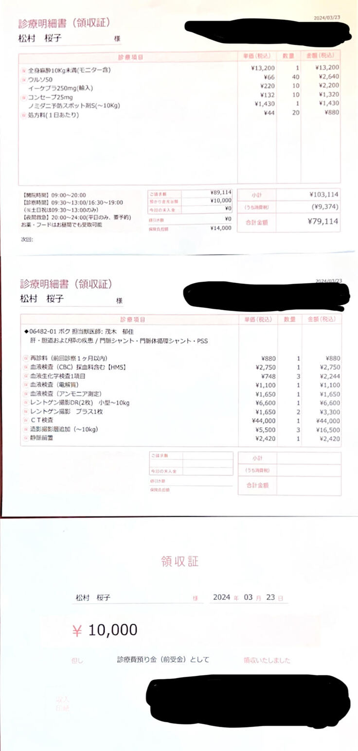 門脈シャント手術2回、CT検査、血液検査、肝臓サポート療養食など
