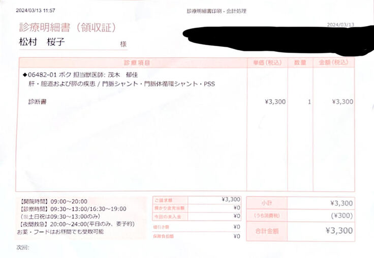 2024年3月13日 3,300円/3,300円 ※保険適用なし 当プロジェクト記載のための診断書料金