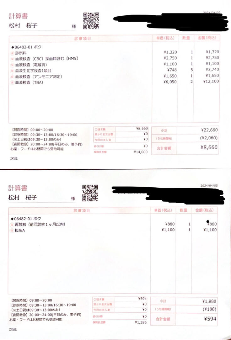 B…2回目手術に関わる治療費の一部 106,414円/82,414円(今まで支払った金額)