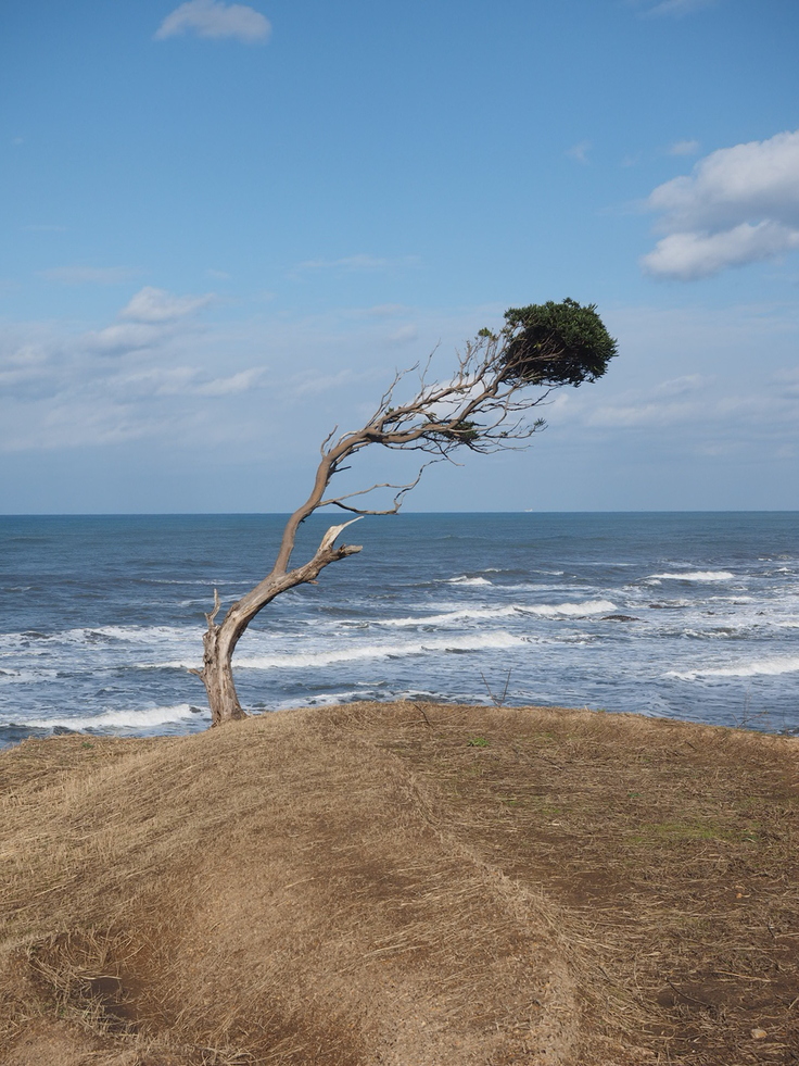 千枚田に生えているトベラの木。日本海から吹き付ける強風に立ち向かうのではなく形を変えてしなやかに生きている