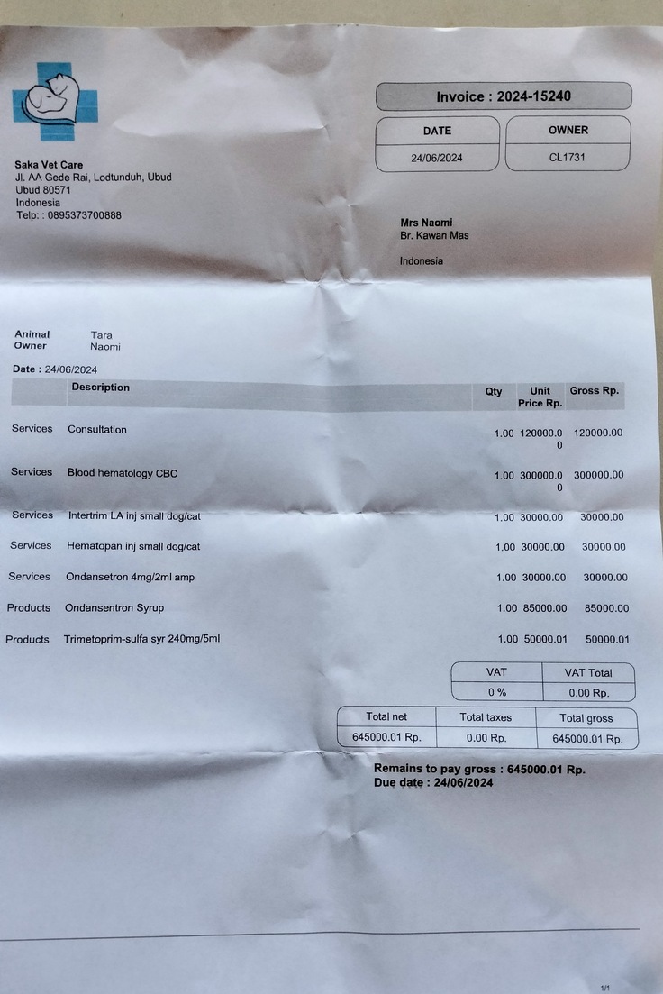 下痢と嘔吐をしているタラちゃんをクリニックに連れて行ってきました。
