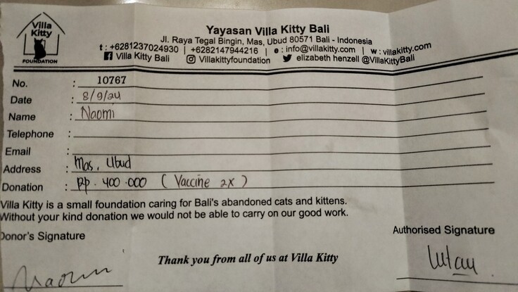 クリニックで接種すると一匹Rp450.000、保護施設だとRp200.000です。