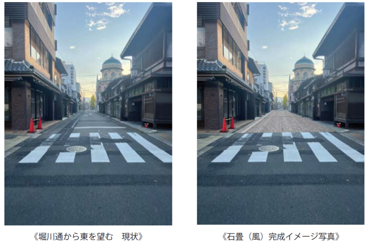西本願寺から、門前町、本願寺伝道院、デュシタニ京都までの一本道を「石畳(風)道路」にして街並みを更に良くし、参拝される方・観光で散策される方達にもっと風情ある門前町として歩いて頂き、地域活性させていきたいと考えております。