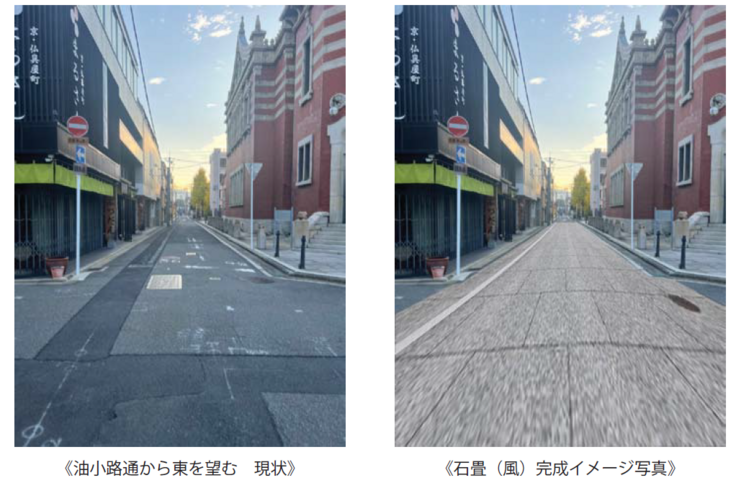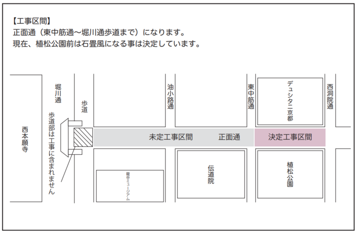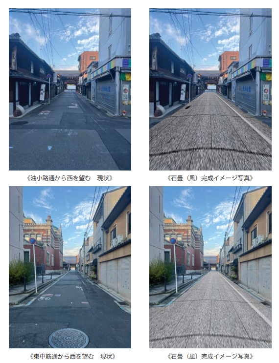 現在の計画では植松公園前の道路(西洞院通~東中筋通まで)は石畳(風)の道路で本舗装され、続く東中筋通~堀川通まではアスファルトにて本舗装する事になっております。途中まで石畳(風)のアスファルトで新しい道路を造るのならば、是非この機会に門前町長年の夢だった「石畳(風)道路」を堀川通まで出来ないかと関係各所様に相談してまいりました。