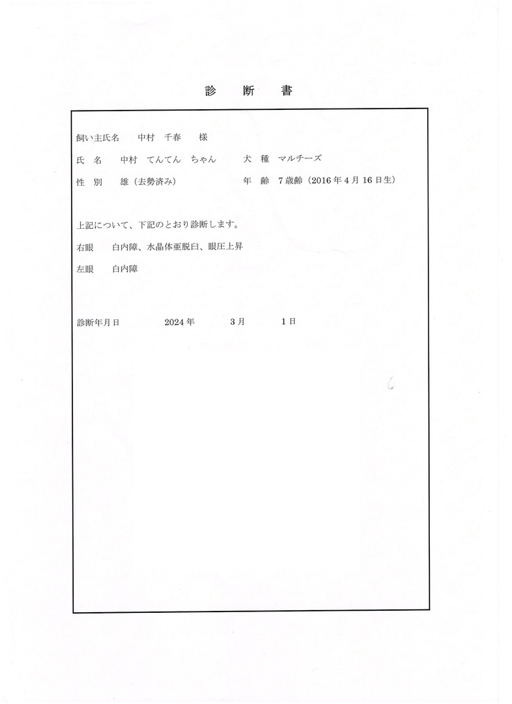 "てんてん"の白内障が進行していて、網膜剥離や失明の危険があったため