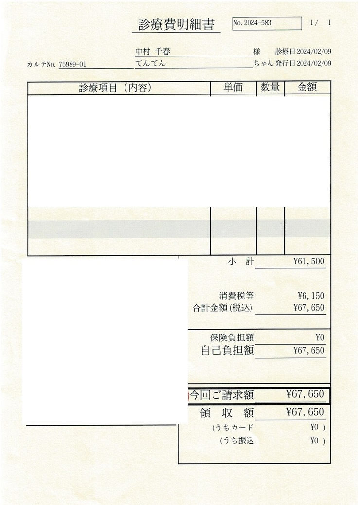 ページ上に掲載している診断書や診療明細書などの資料は、病院名等を控えることで動物病院から掲載の許諾を得ております。