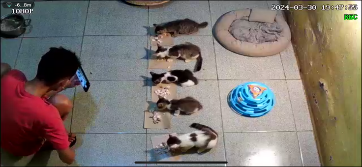 乳離れした仔猫たちがお行儀よく夕ご飯を食べています。その様子を撮影するユディさん。