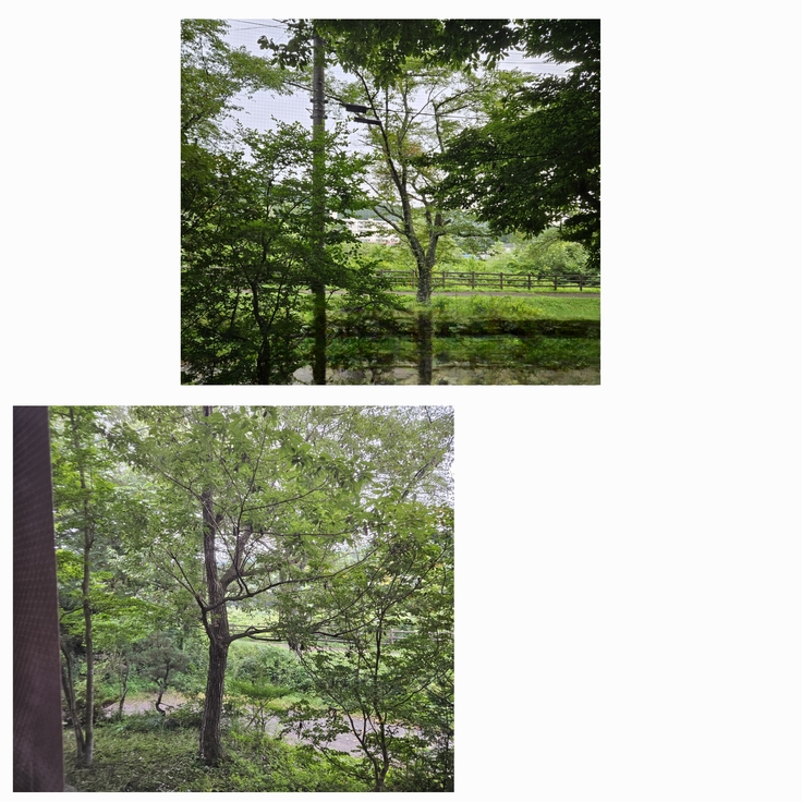 窓の外の風景……敷地内に大きな木が、たくさんあり