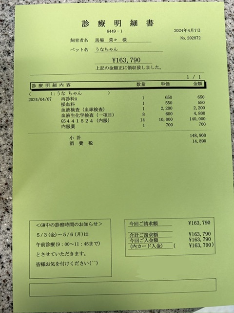 病院に行くと、怖くてブルブル震えてるうなちゃんですが、採血中も毎回お利口さんです。