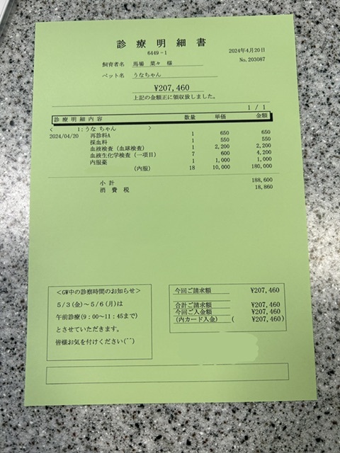 ※ 直接支援でいただいた支援金は、返金はせずウナの治療薬代にあてさせていただきます。