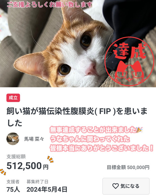 猫伝染性腹膜炎を患ったポンちゃんの明日をつないで頂けないでしょうか