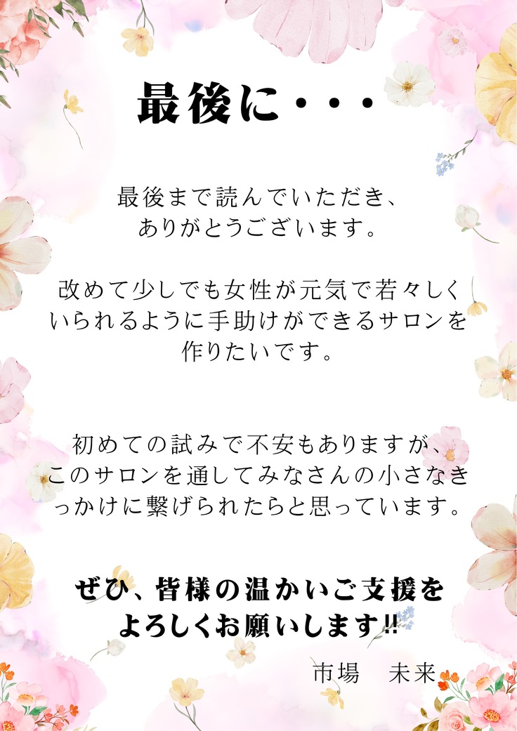 言葉のように肉体的・精神的な疲労や悩みを抱える女性に対してアプローチできるサロンを作りたいと思っています。