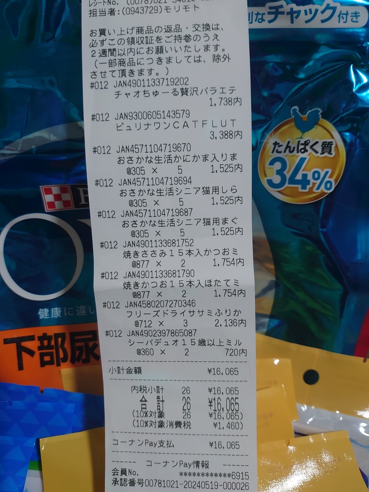 5月19日 猫のご飯代16065=317484円になります。
