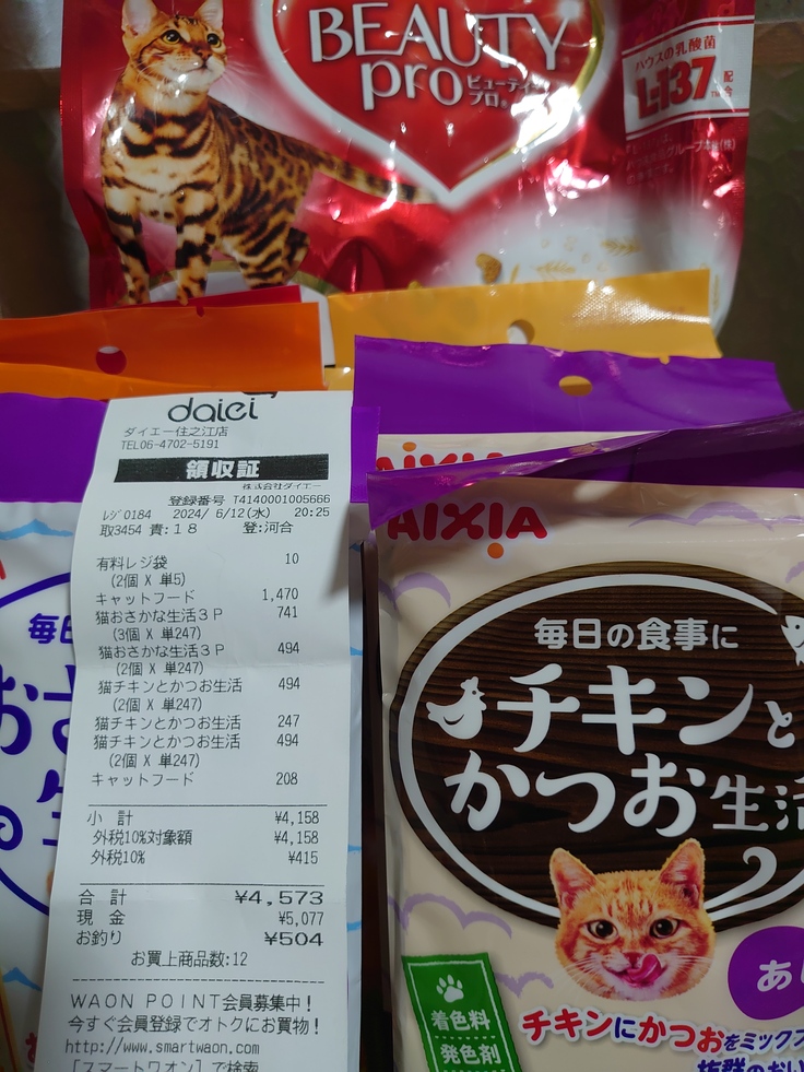 支援金残金224962−6月12日フード購入品4573−6月15日病院での支払い合計17820=202569