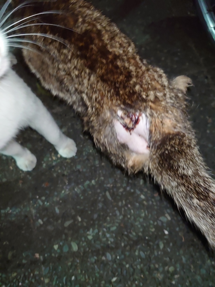 キジの猫のルー君、おしり辺りの毛がなく化膿した傷が見受けられました。2日私の餌場に来てませんでした。