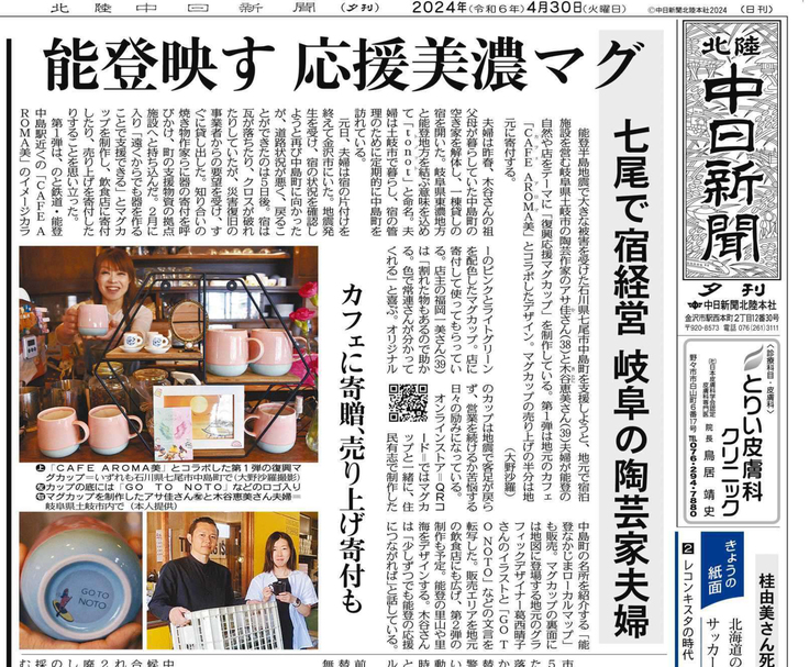 能登復興に向けて、宿近隣の飲食店さんと『アロマ美さん/七尾市中島町』コラボしたオリジナルマグカップをお届けしました。