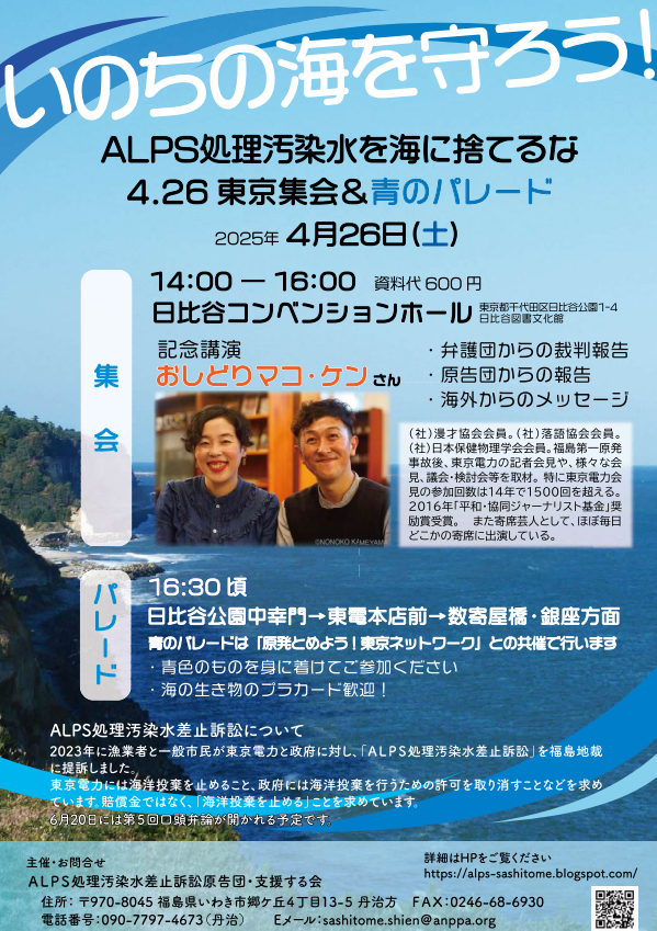 いのちの海をまもろう ALPS処理汚染水を海に捨てるな 4.26東京集会&青のパレードのお知らせ