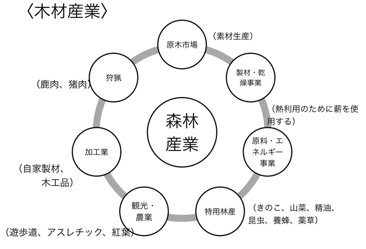 森林施業により、原木販売と森林を活用した副産物、広葉樹や端材を利用した木工品の製造販売などを行い、短期的な側面も持った百業型の林業経営を行います。