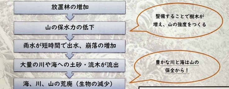 放置林は、山の保水力・強度の低下による土砂崩れの誘発や河川・海洋への土砂の流出など、沢山の危険性があります。