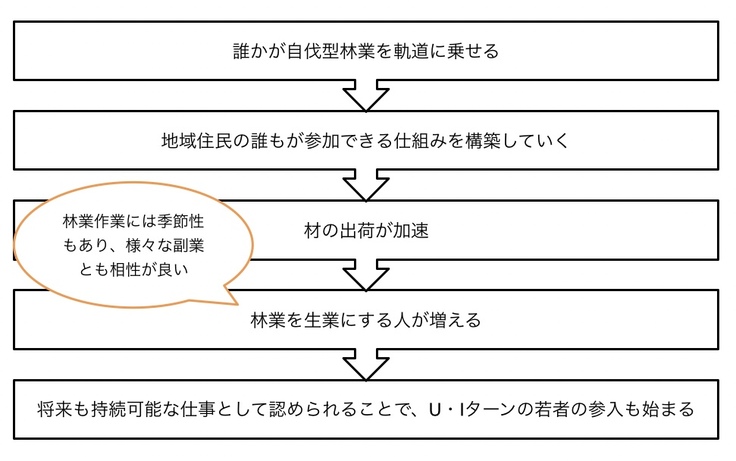現状、山林は多いですが、個人で林業を業にしている人はいません。誰かが始めることで大きな可能性を秘めている産業だと考えています。