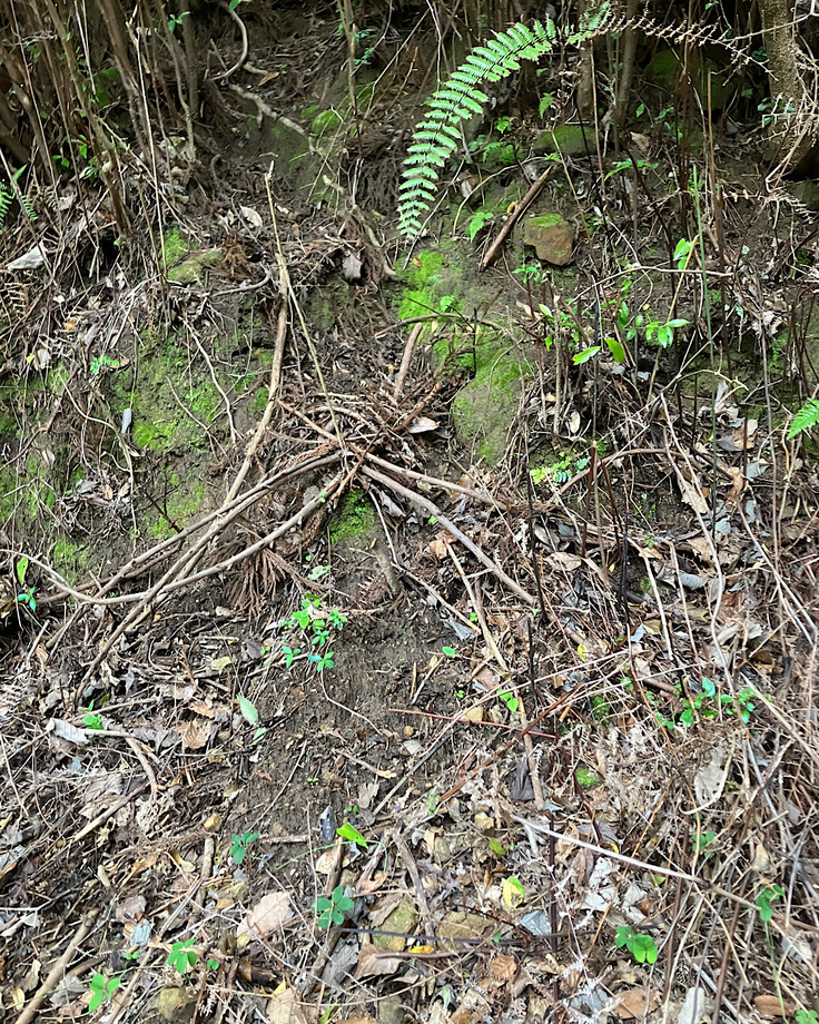 上から獣道が通ってきて、道の脇はここだけ土がたくさん落ちて来てました。