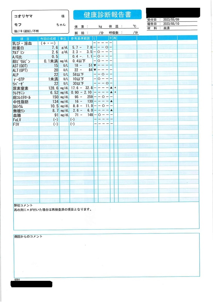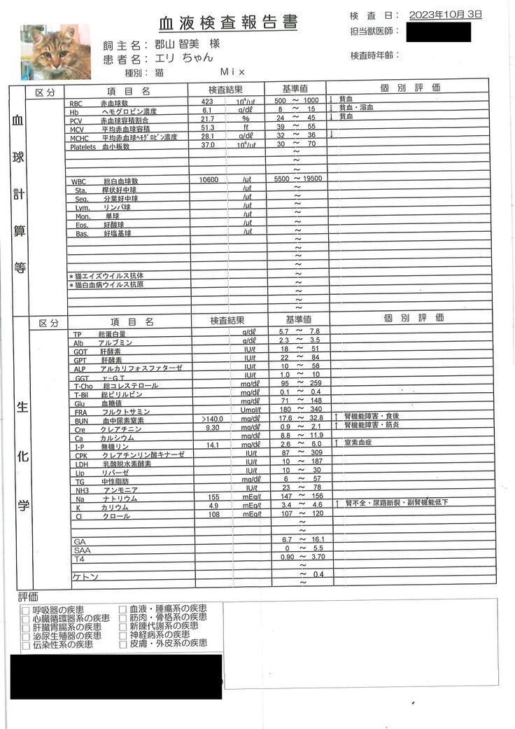 後日、血液検査の結果をお聞きした際、猫エイズ・猫白血病は陰性、