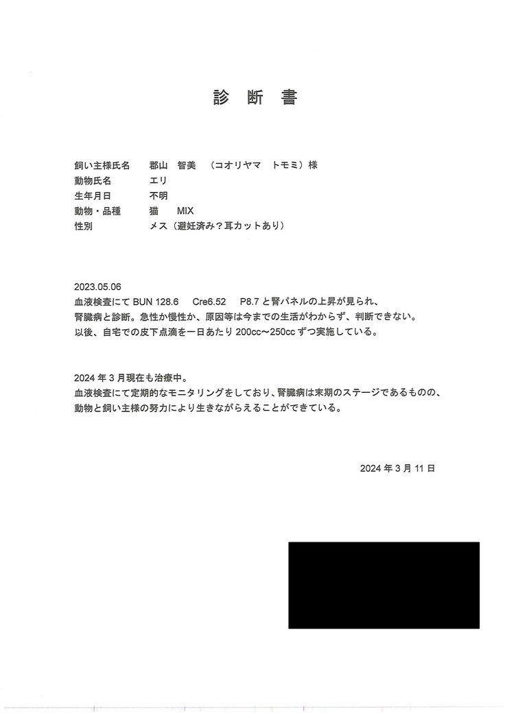 保護猫エリの治療費(緩和ケア)及び通院費に充てさせていただきます。