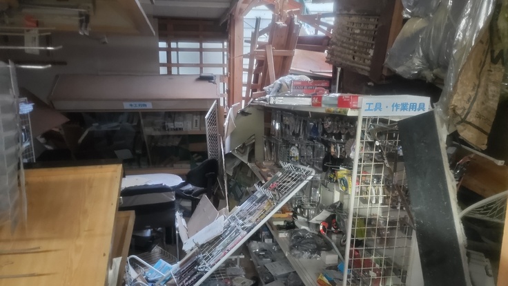 店舗部分の建物は倒壊し、ほとんどの商品や仕事道具が瓦礫の下敷きになり、倒壊を免れた場所も足の踏み場もない程に物が散乱しました。