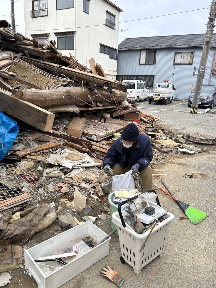 倒壊した店舗の取り壊し後、なんとか無事なものを取り出そうとしていますが、ほとんどの商品や仕事道具が瓦礫の下敷きとなってしまいました。