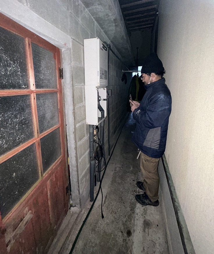 震災後、夜間に緊急で連絡を受け、仮設給湯器を設置確認している様子です。