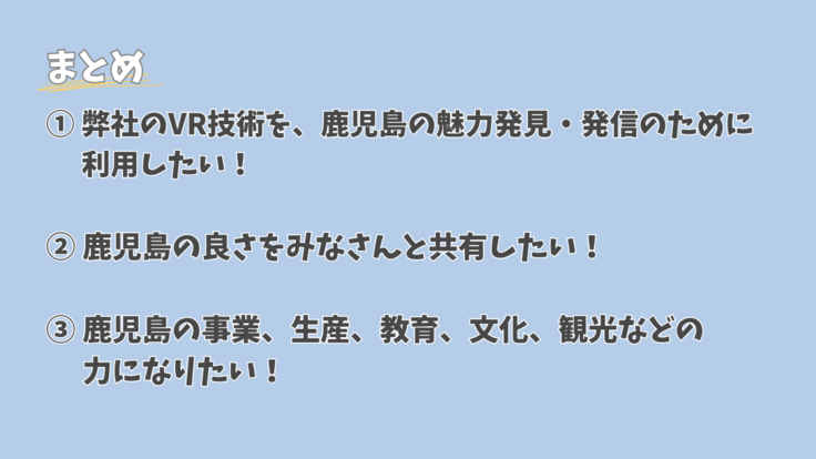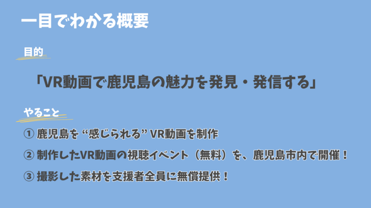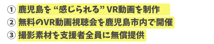 鹿児島の魅力を伝えるために弊社のVR技術を使用します。 ①VR動画制作 ②視聴イベント開催 ③リターンを通して、鹿児島の魅力を共有、発信します。 ご支援は以下の用途で使用します。 ・VR動画制作 計2本 34万円 ・イベント準備, 実施費用 69万円 ・その他(サービス手数料+税) 16万円