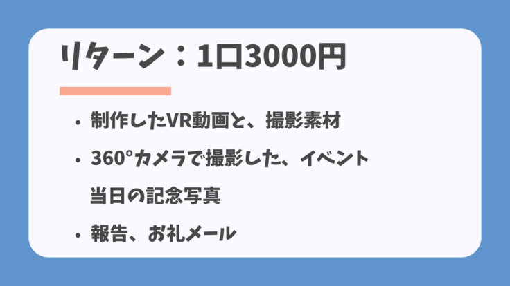 ①このプロジェクトで制作したVR動画をお送りいたします。また、撮影した360°動画の素材を、ご支援くださる皆さま、企業様、団体様に、無料でご提供いたします。※お渡しの方法については、別途メールでお伝えします。 ※再生には、再生ソフトが必要です。ソフトは無料で使用できるものもあります。