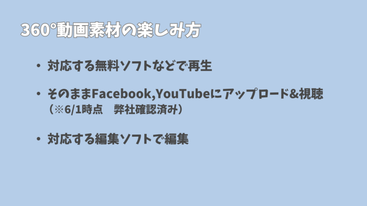 FacebookやYoutube(※6/1現在 弊社確認済み)に素材をアップロードするだけで、簡単に楽しめます。