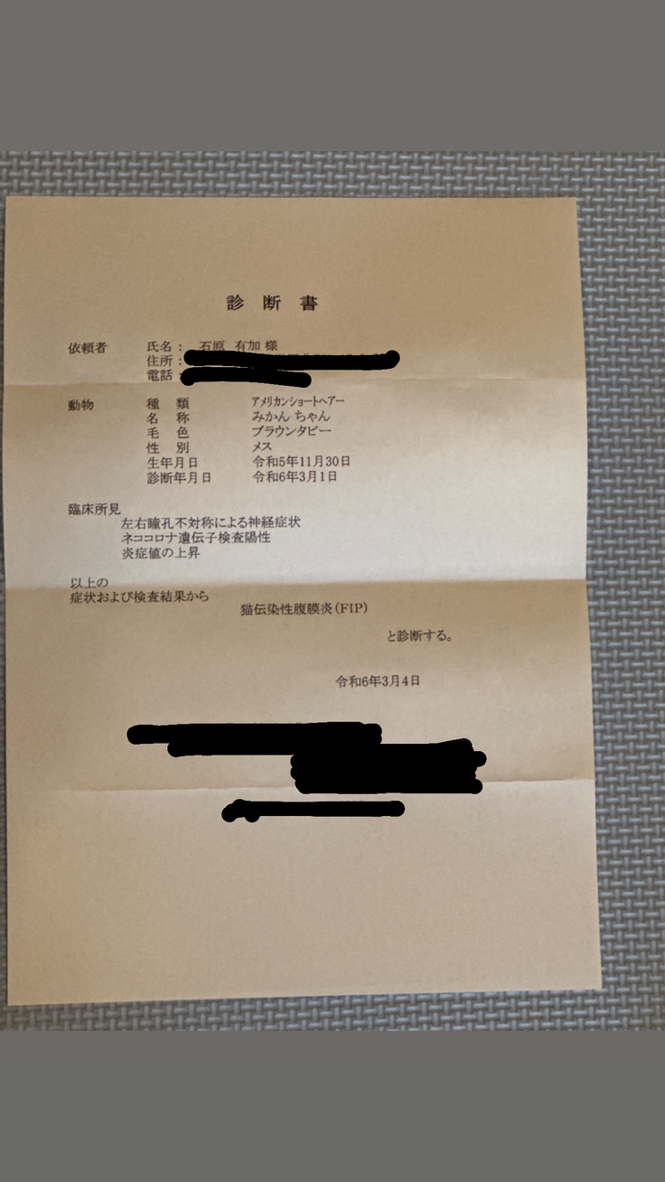 血液検査の結果を総合してみてFIP(猫伝染性腹膜炎)と診断されました。
