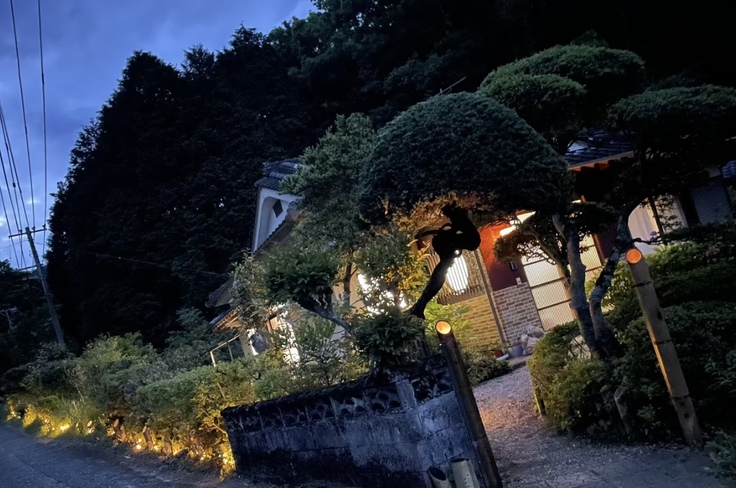 築40年の昭和レトロな宿です。おばあちゃん家の隣の竹藪を伐採しその竹を使って竹灯籠を作りました。お宿の周囲に100本以上の竹灯籠を設置。夜になると街灯もない所なので竹灯籠の光が優しく包んでくれます。朝は優しいお日様の光と小鳥のさえずりで目覚めます。