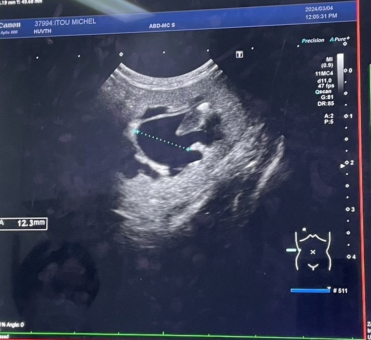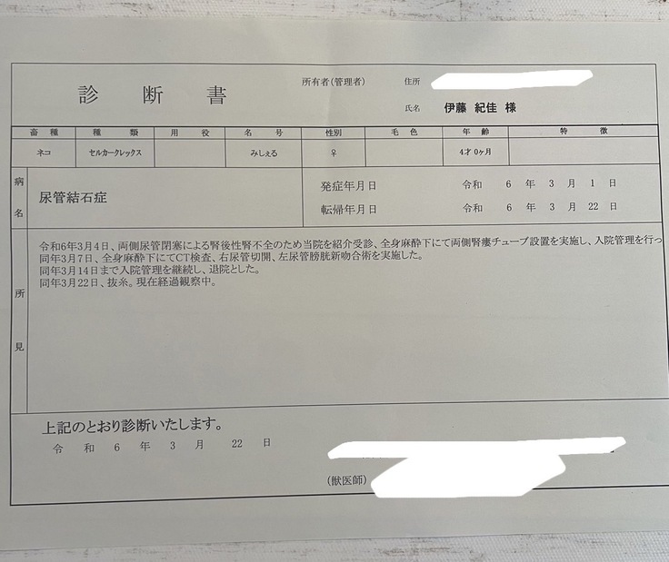 点滴入院を続けても、みしぇるの状態は悪化するばかりで数値の改善も見られず、大学病院(後B病院)を紹介していただき、3/4に受診しました。その結果、腎臓・尿管ともに結石が見られ、尿管は結石により詰まっており、腎臓も圧迫されている状態でした。