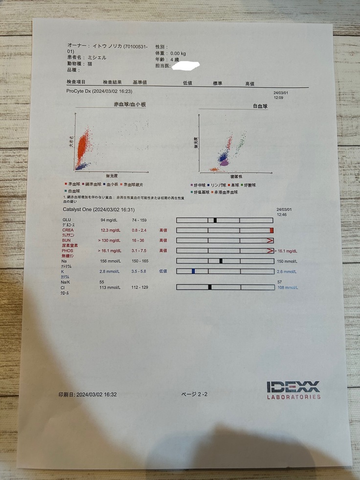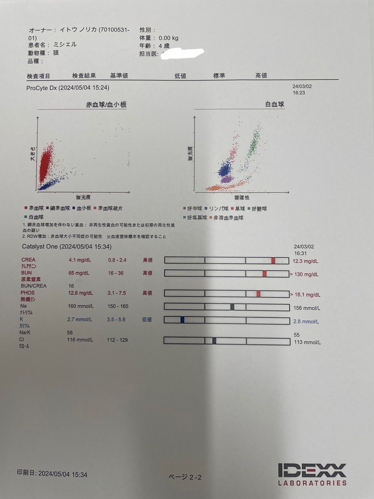 みしぇるの異変に気づいたのは2024年2月末になります。じーっと座っていることが増え、多飲多尿・食欲不振も見られ、A病院へ向かいました。その結果、腎不全Stage4と診断されました。ひどく貧血もあったことから、慢性腎不全が疑われ、直ちに点滴入院することになりました。