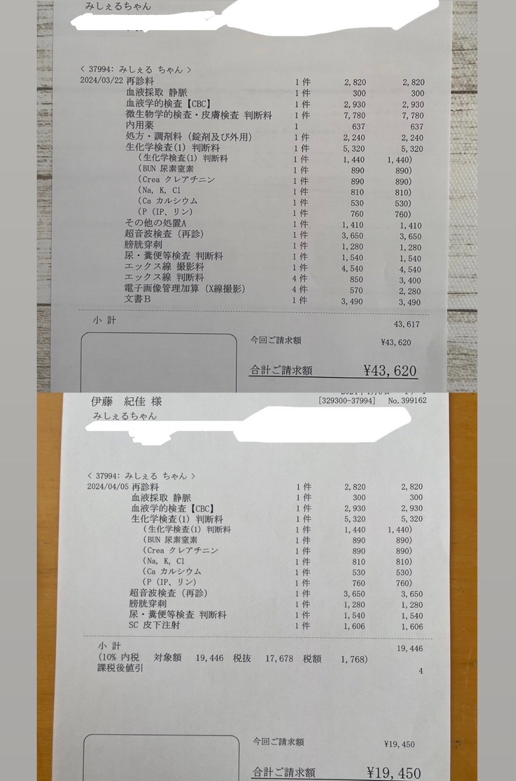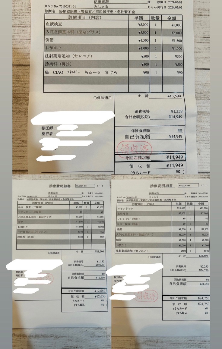 上記に加えて、追加の検査・治療代が見込まれ(体調や状況によって治療が変わるため)、2024年3月〜12月までにかかる総額は130〜150万前後になる見込みです。(ペット保険未加入)