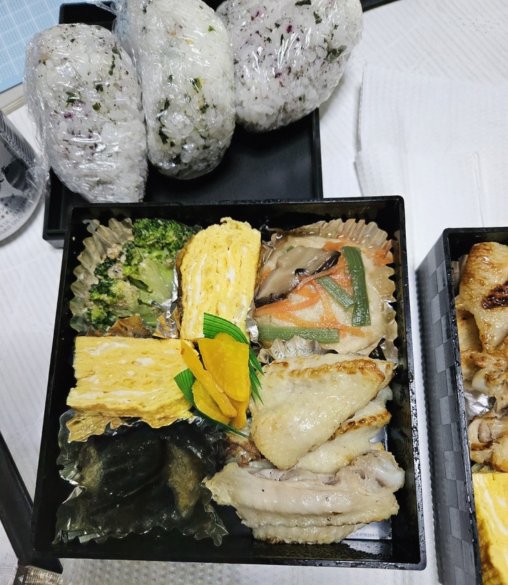 今日は、手羽塩焼き、白身魚と豆腐の甘酢あんかけ、なすの味噌炒め、葱のだし巻き玉子焼き、ブロッコリーのごま和え、青菜のおにぎり、ゆかりワカメのおにぎりです!