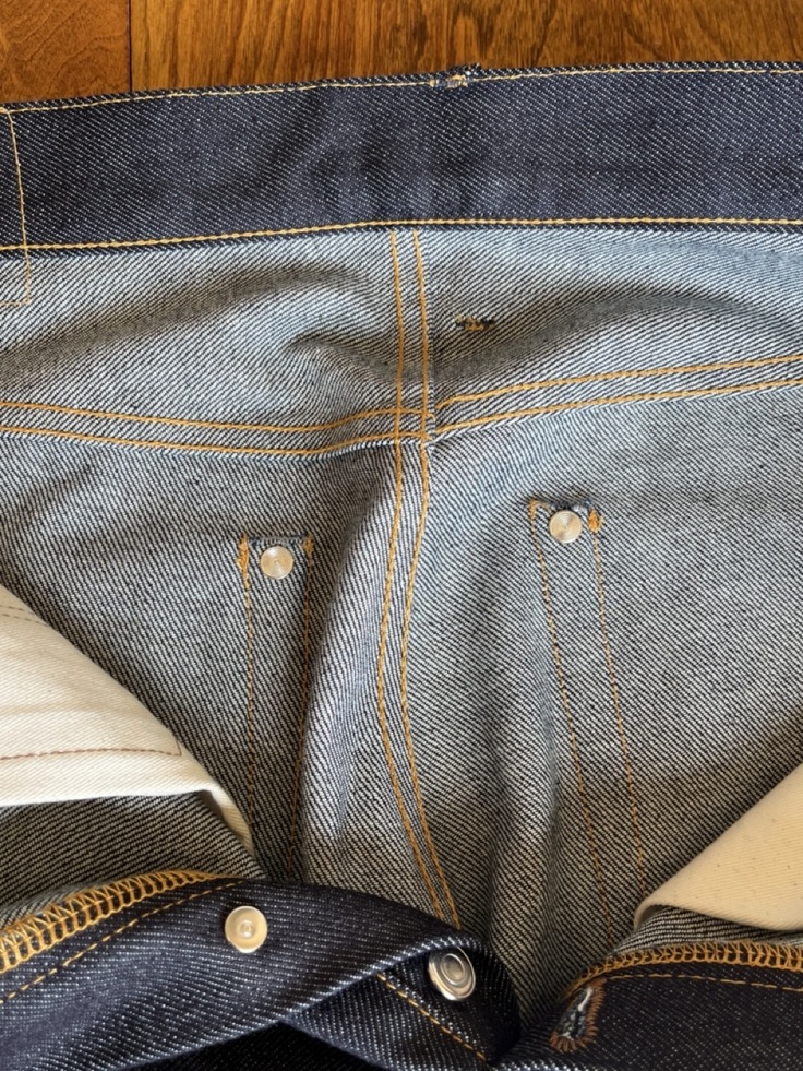 今回は当時のロウデニムの雰囲気を残すためスキュー加工だけ省きわざとねじれを生じるように設定してある