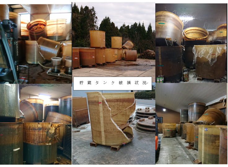 中学校に避難するのを諦め、貯蔵タンクのある倉庫へ被害の確認に向かいました。1棟目の倉庫に入り幸い停電していなっかたので灯りをつけたら、そこには目御疑う様な光景が…。正直もうダメだ…。と思いながらもメインの貯蔵タンクが多い2棟目へ。倉庫の中に入るまでもなく、さらに酷い状況でした。シャッターの隙間から液ともろみが外まで散乱してました。