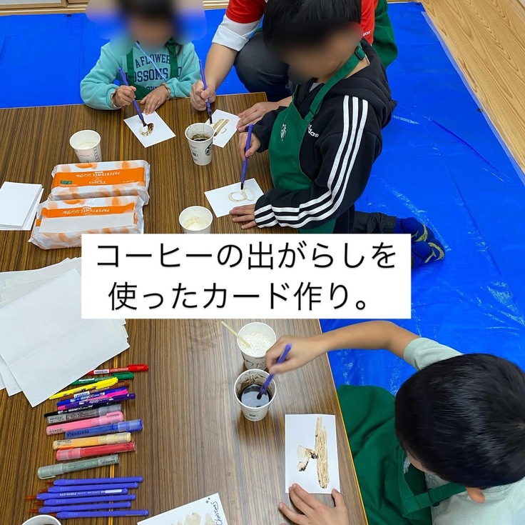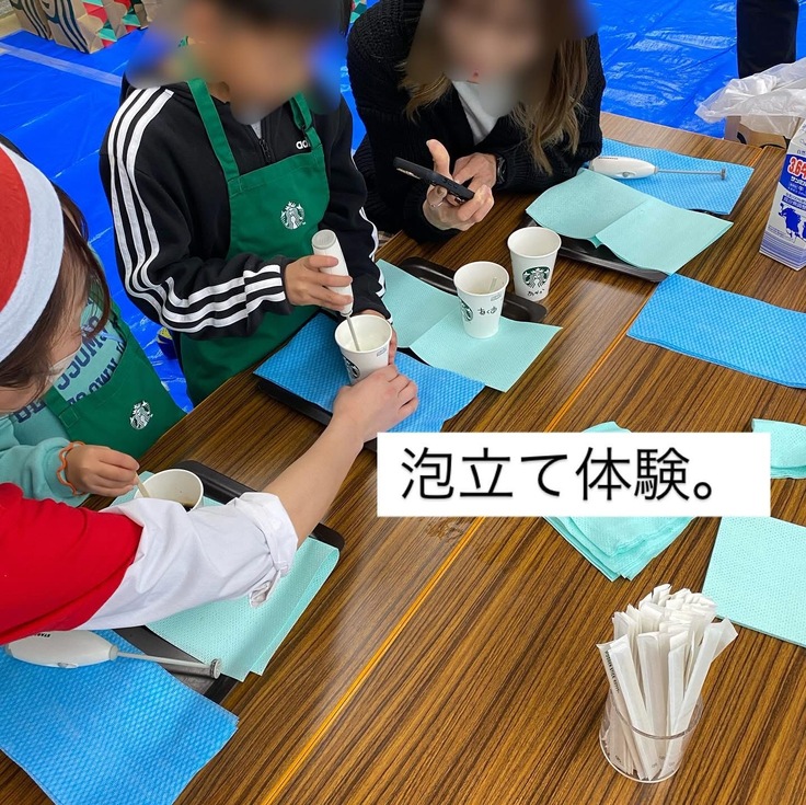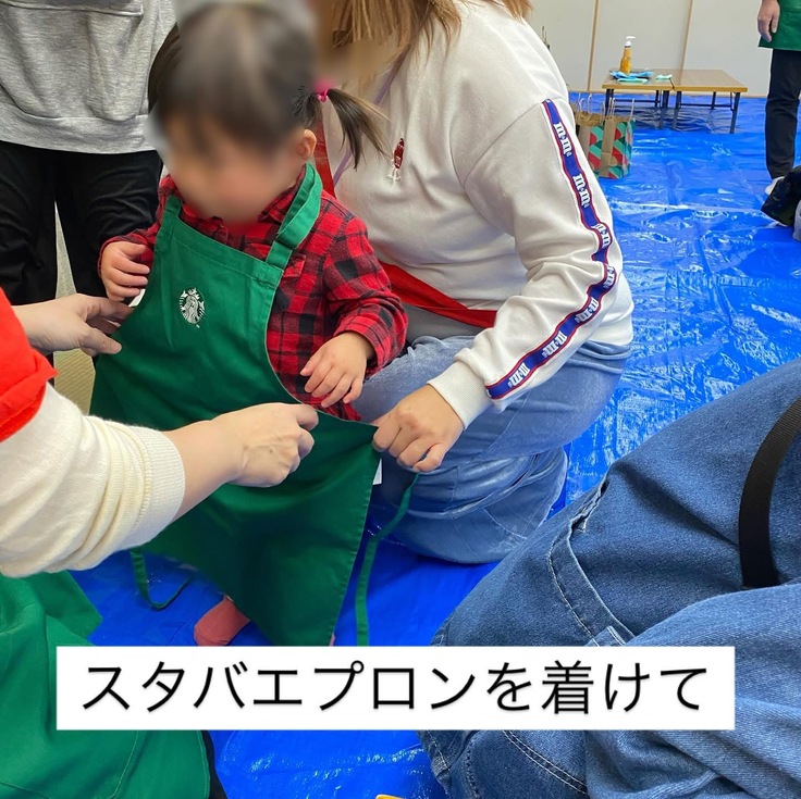 当日もスタッフの方にお越しいただきこども達はスタバエプロンを身につけて泡立て体験やコーヒーの出がらしをつかったお絵描きをスタッフの皆様が優しく丁寧に実施してくださり、こども達にも貴重な体験となったと思います😊