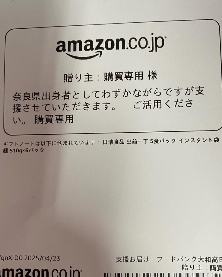 購買専用様から先日に続いてインスタントラーメンのご寄付をいただきました❣️
