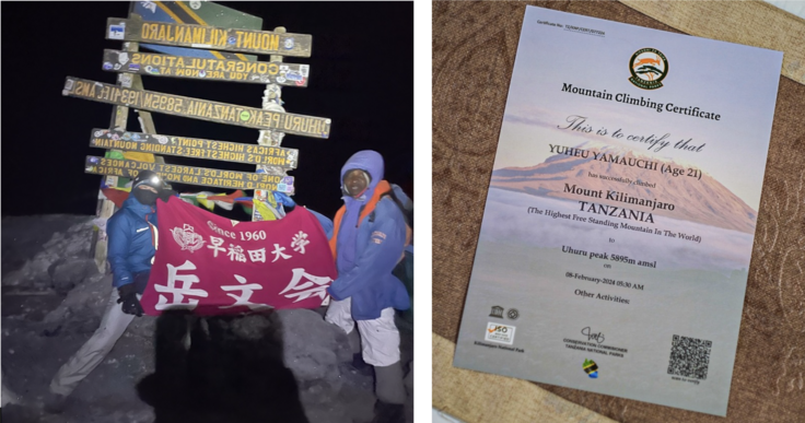 山内 悠平(やまうち ゆうへい) 2002年生まれ。21歳。早稲田大学 教育学部 4年。 大学入学と同時に登山を始める。早稲田大学岳文会の幹事長を務め、100名規模での北アルプス縦走へ挑戦。 クラウドファンディング(CAMPFIRE)にて活動資金を集め、2024年2月にアフリカ大陸最高峰キリマンジャロ(5895m)へ登頂。
