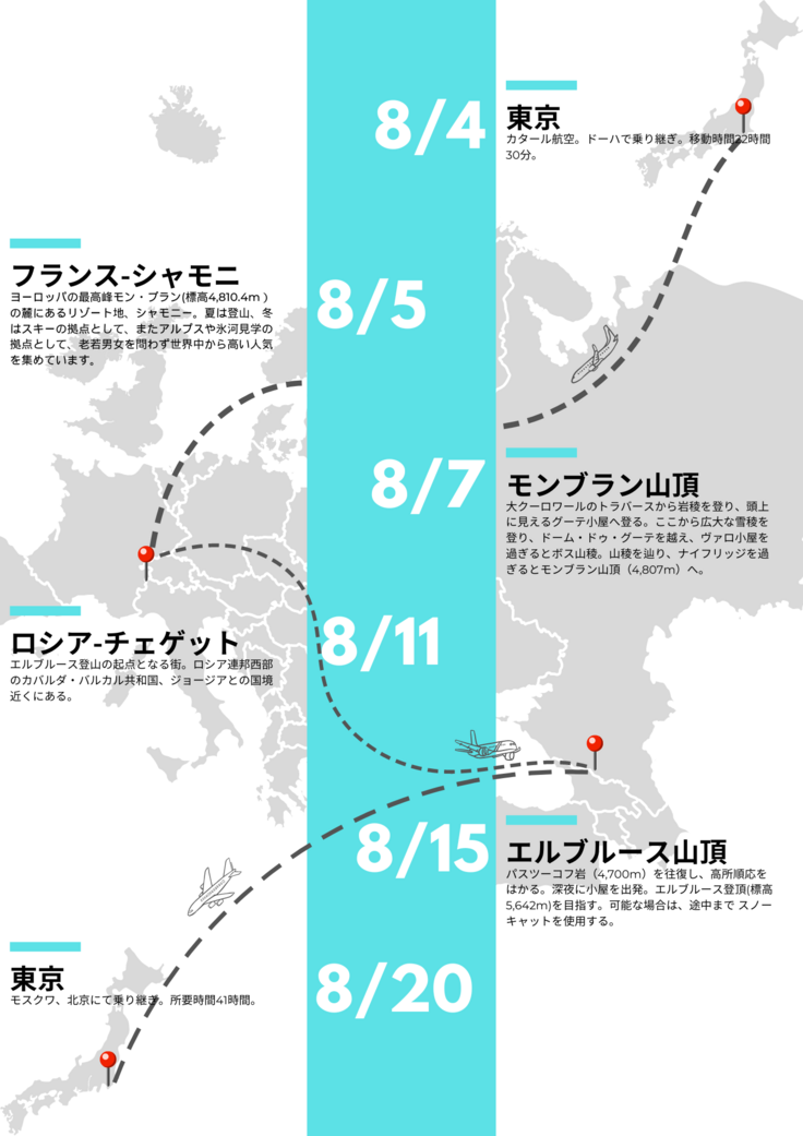 本活動は7大陸最高峰の日本人男性最年少記録更新へ向けた、モンブラン(フランス)とエルブルース(ロシア)登頂を目指す個人遠征です。活動場所はフランスのシャモニ、ロシアのチェゲット。活動期間は7/31-8/16までの17日間です。始めにモンブランへ登頂した後、ヨーロッパ大陸最高峰であるエルブルースへ挑みます!!