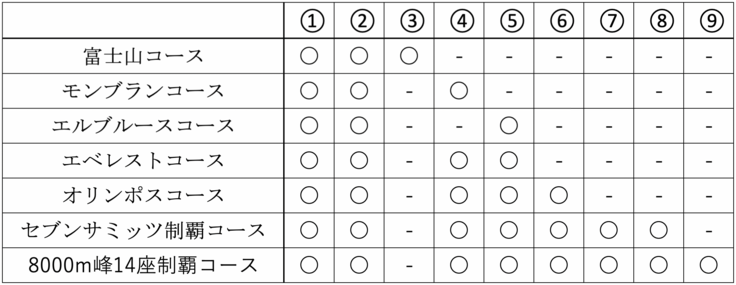 オリンポスコース、セブンサミッツ制覇コース、8000m峰14座制覇コース・・・[書籍にて配布]