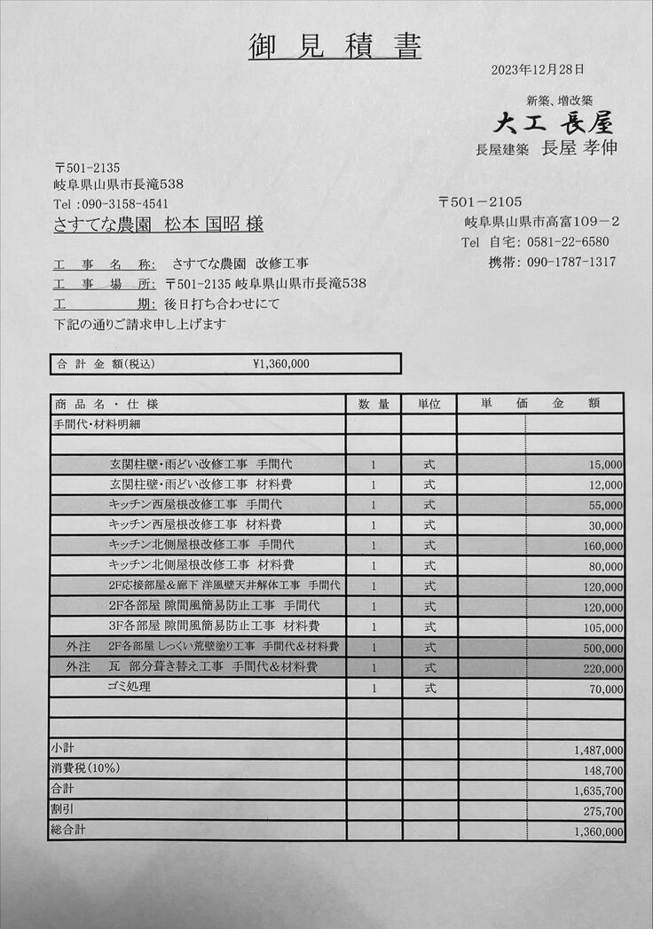 d)地元大工、地元材によりリノベ―ト 今回の改修ポイントを地元大工さんに下見していただき見積りを提示していただきました。木材高騰の心配もありましたが、木工改修工事、屋根雨樋工事、塗装工事を込みで、かなり効率的な見積となりました。この工事が、完了すれば、農家民泊の許可申請も容易に可能だと思われます。