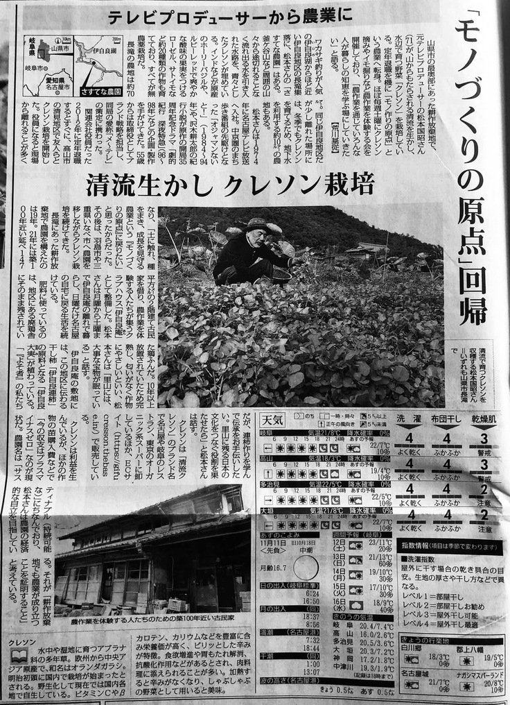 翌1月~古民家近くの耕作放棄地の畑約3反を借用契約。新しいクレソン水流園を新設(現メイン農園)大森地区に地下水を利用したかけ流し方式で栽培するクレソン園も借用契約。(現サブ農園)二つの栽培法によるクレソン栽培法が確立