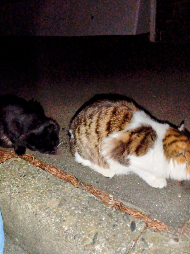 本当に驚く事を聞きました。市営住宅の餌やりのおばあちゃんにやっとお話が出来ました。夜中に猫同士のケンカの声を聞いて出てきた様です。私が餌をあげようとした時に猫同士でケンカが始まったのでした💦懐中電灯を持って出て来た人が居ました。顔を見たら餌やりのおばあちゃんでした…