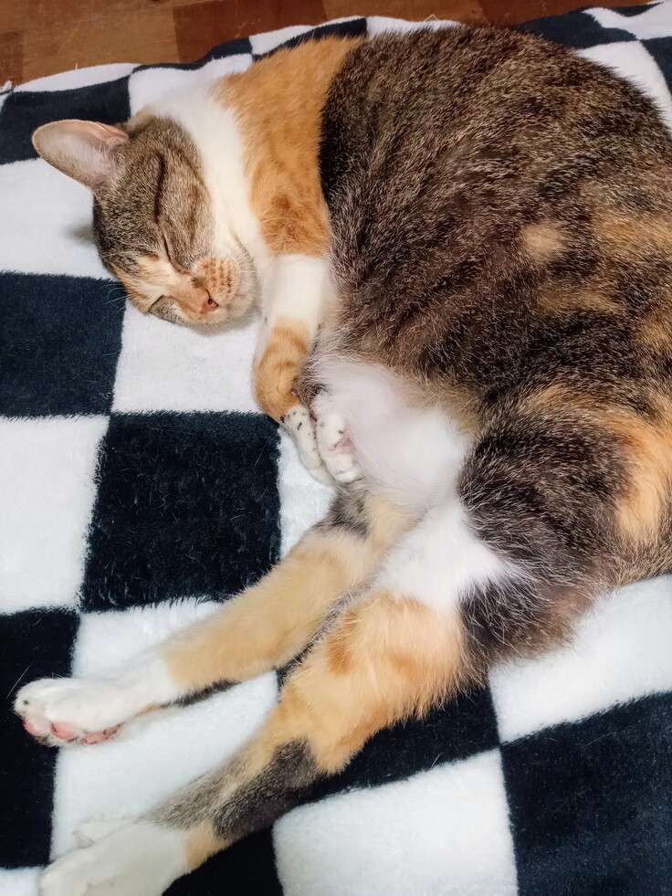 ミミちゃんの痛み止めのお薬が効いた様で、珍しく両足をピンーと伸ばして熟睡してくれています😊 動物は言葉が話せないので、痛みを訴える事も出来ません💦飼い主が注意して体調管理をしてあげなければいけませんね。その代わり自分の体調管理は放ったらかしですが😅